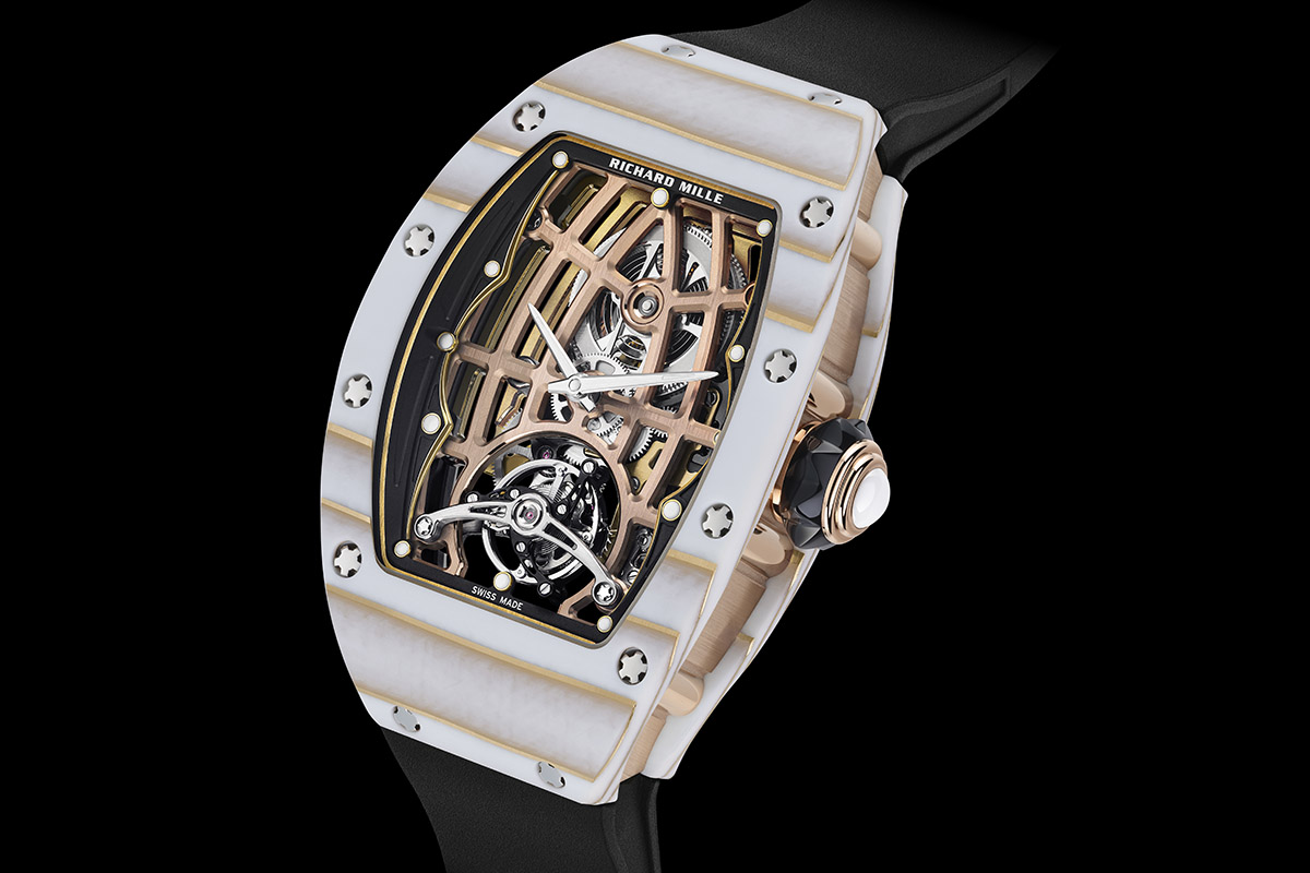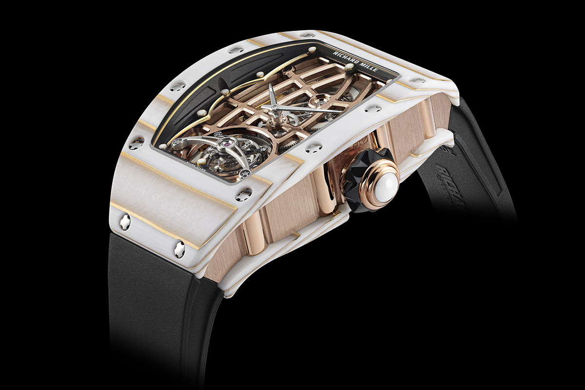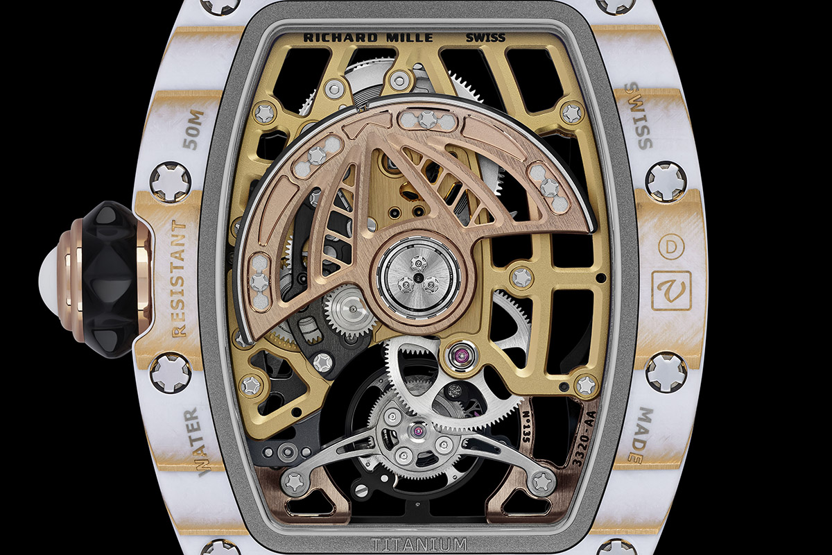 L’RM 74-02 invece ha la cassa in Gold Carbon TPT®, che accosta il materiale composito nero a un metallo prezioso: l’oro in foglia. Anch’esso leggero ma robusto, si distingue per la damascatura nera opaca, tipica delle fibre di carbonio, impreziosita da venature in oro giallo a 24 carati. Oltretutto in questo caso il metallo nobile entra a far parte anche della meccanica, il Calibro CRMT5 di manifattura. Il movimento, a carica automatica, dalla costruzione scheletrata e con dispositivo tourbillon, presenta infatti platina e ponti in oro giallo o rosa.