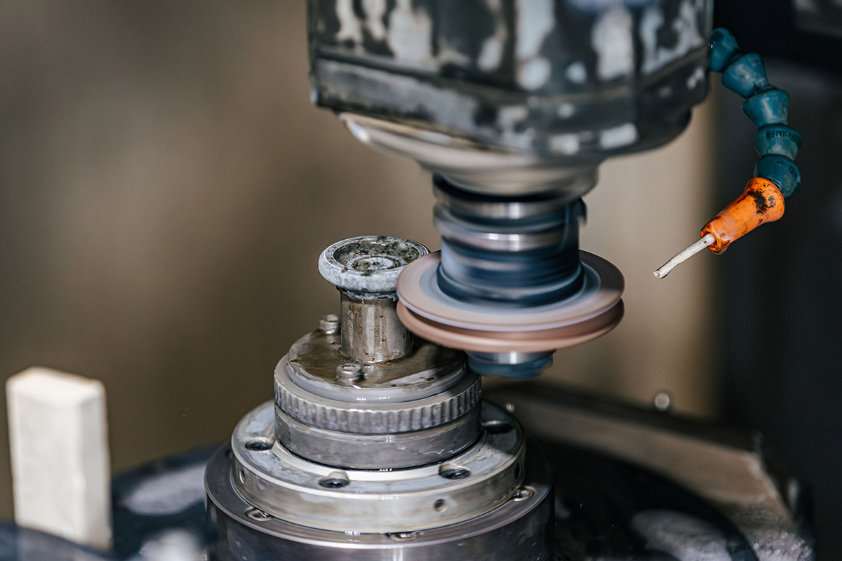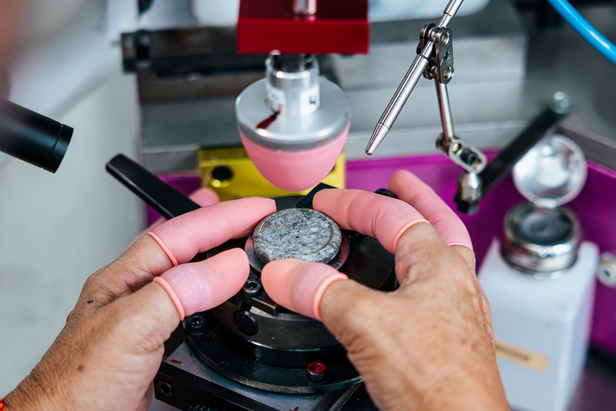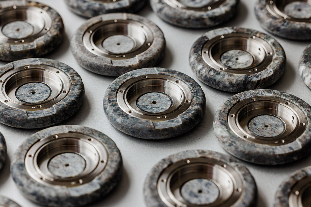 Tant’è che i laboratori della manifattura utilizzano ancora gli stessi artigiani e gli stessi macchinari di 40 anni fa (ovviamente forniti di nuovi utensili). Fresati in cilindri più piccoli, poi tagliati a “fette” più sottili, i pezzi di roccia vengono così molati e modellati fino a ottenere i 38 mm di diametro della cassa attuale. Quindi scavati per ospitare il movimento al quarzo, che a sua volta è racchiuso fra il vetro zaffiro lato quadrante e il fondello in acciaio. Se date un’occhiata alla gallery in alto, potete vedere le principali fasi di lavorazione.
