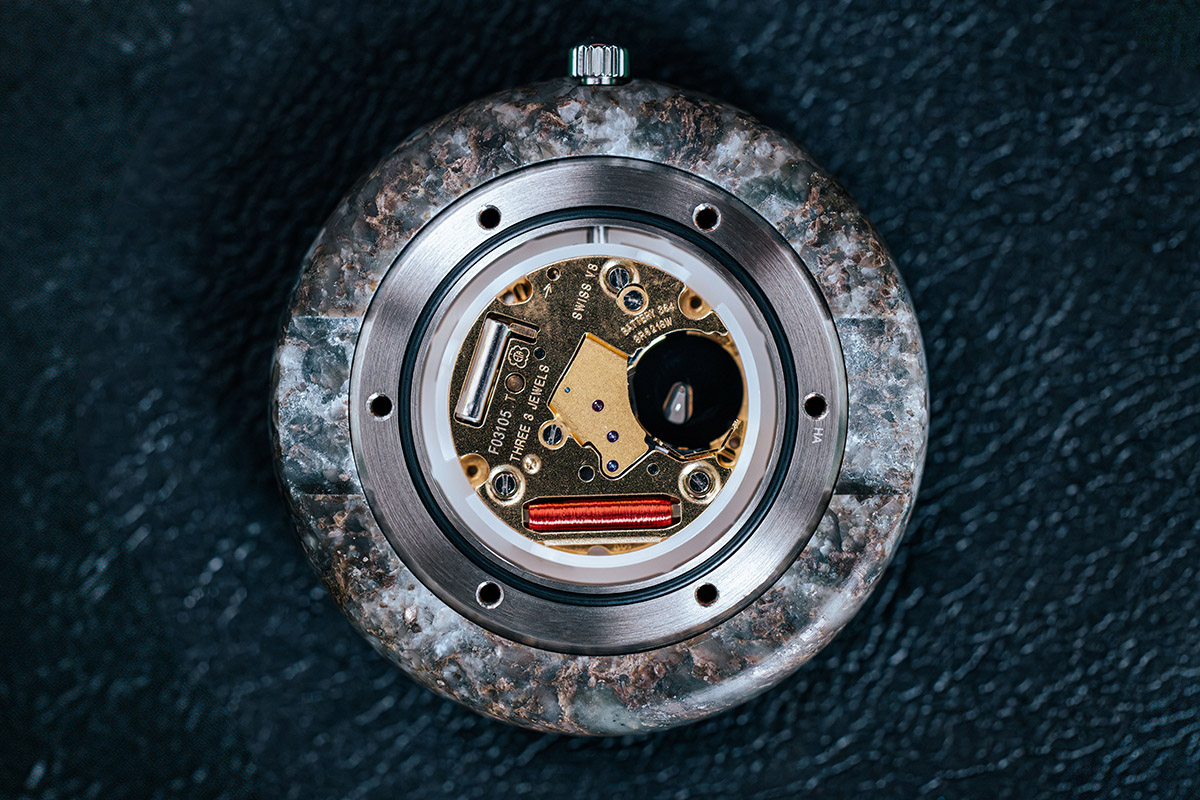 Ma prima di raccontarvi del nuovo RockWatch, è indispensabile dire qualcosa sul modello originario. Nato da un’idea dello scultore Peter Kunz, vide la luce appunto nel 1985. Il granito della cassa proveniva in particolare dalle Alpi dei Grigioni (Andeer, Julier), del Ticino (San Fedelino), del Vallese (Collonge) e da altre aree della Svizzera (Habkern, Gottardo). La diversa zona di estrazione influiva sul tipo di minerale e sulle sfumature cromatiche della pietra.