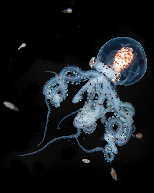 Anche quest’anno Blancpain conferma il proprio impegno nella tutela della vita oceanica, con il sostegno all’Ocean Photographer of the Year 2025, che ha riunito oltre 15mila immagini da tutto il mondo. Vincitore: Yury Ivanov, esperto di macrofotografia in Indonesia, per l’immagine di due “coccinelle di mare” (minuscoli crostacei del genere Amphipoda) su un corallo. Mentre il Female Fitfy Fathoms Award è stato assegnato alla biologa marina cinese Jialing Cai, specializzata nel catturare con l’obiettivo le creature nascoste nello zooplancton. Come il piccolo polpo wonderpus (accanto) circondato da una varietà di piccole larve di gamberetti, granchi e vermi.
