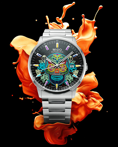 Sesta edizione realizzata dalla Casa per il Dia de los Muertos. Qui l’immagine del celebre teschio si tinge coin 10 cromie e si illumina al buio, grazie all’uso di Super-LumiNova a emissione turchese e verde. Attraverso il quadrante in acrilico sfumato si intravvede il Calibro 80, realizzato in esclusiva: a carica automatica, è dotato di autonomia di 80 ore e spirale in Nivachron, antimagnetica. La cassa di 40 mm in acciaio è corredata di bracciale metallico, facile da sostituire. Il packaging include due cinturini aggiuntivi, in pelle nera o in gomma arancione testurizzata. 1.290 euro.