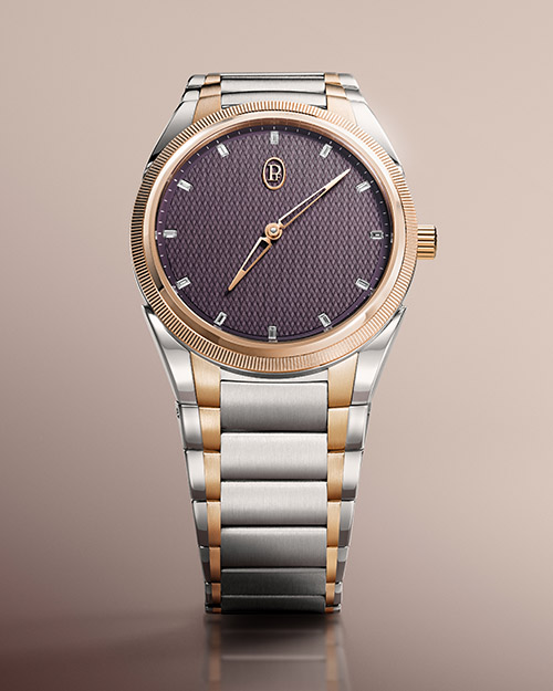 Torna l’esemplare più piccolo dell’apprezzatissima collezione. La novità sta nel metallo in cui è forgiato: acciaio e oro rosa. Per il resto, tutto rimane com’era: il colore sofisticato del quadrante, tra il prugna e il bordeaux, dalla lavorazione grain d’orge incisa a mano; i diamanti baguette agli indici; il bracciale rastremato, fluido ed ergonomico; le finiture superlative. Il movimento di manifattura è sempre il Calibro PF770, a carica automatica, con 60 ore di autonomia. Immutata è anche la sensazione di lusso discreto, sobrio, impeccabile. 32.300 franchi svizzeri.