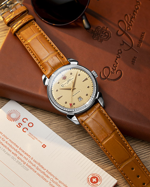 Primo esemplare con certificazione Cosc del Marchio svizzero-cubano, è animato da un movimento automatico, calibro Soprod Newton P092. Ma mantiene la tipica ispirazione vintage della collezione: la cassa di 40 mm in acciaio, priva di lunetta, con vetro zaffiro glass box e lunghe anse aggettanti, riprende i modelli della Casa degli anni 50. Il quadrante, decorato à frappage e con il doppio cartiglio, è disponibile in tre versioni: argenté, champagne e bordeaux. Edizione limitata di 282 esemplari per colore, 3.400 euro.