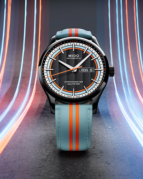 L’ispirazione sportiva, al mondo delle corse, è solo estetica. Ma è comunque efficace, concentrata com’è nei colori azzurro e arancione presenti sul quadrante – a Côtes de Genève annerite – e nel cinturino (intercambiabile) in pelle stampata. La cassa in acciaio Pvd nero misura 42 mm di diametro, mentre il movimento è il celebre Calibro 80: a carica automatica, con autonomia di 80 ore e spirale in silicio, qui nell’allestimento con funzione day-date e certificato ufficiale di cronometro rilasciato dal Cosc. In vendita con un secondo cinturino traforato in pelle nera, stile racing. 1.590 euro.