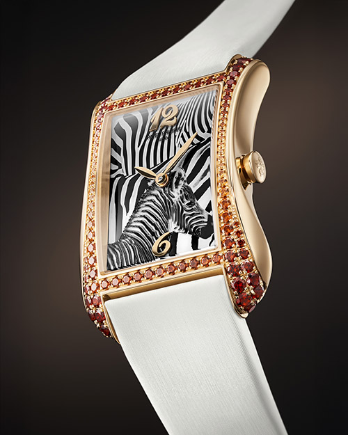 Il femminilissimo orologio da sera d’ispirazione Art Déco torna in una preziosa versione “illustrata”. Ma non si tratta del “solito” (seppur pregevole) smalto. Piuttosto di una tecnica innovativa: il quadrante in cristallo zaffiro è inciso e rivestito di inchiostro su entrambi i lati, quindi metallizzato nero e rivestito di vernice bianca sul retro, così da creare profondità e volume. La cassa cambré in oro rosa misura 28,6 x 40,85 mm ed è impreziosita da oltre 2 carati di spessartiti taglio brillante in doppio dégradé, dal cognac al mandarino. Movimento al quarzo Swiss made. 43.124 euro.