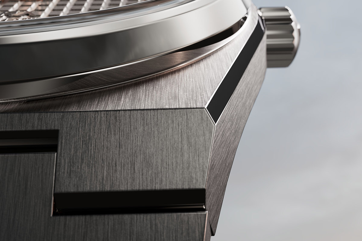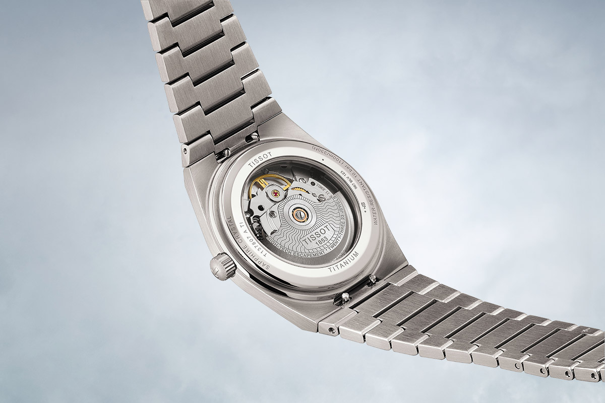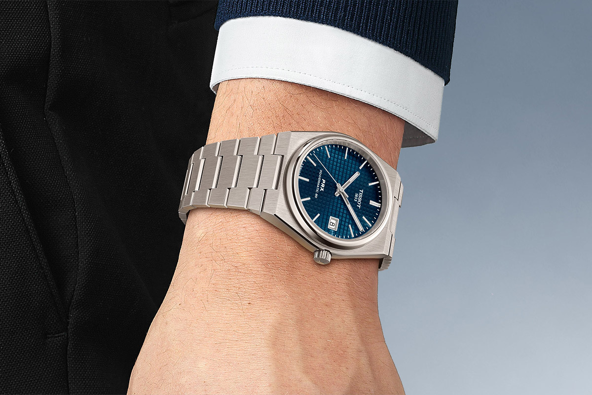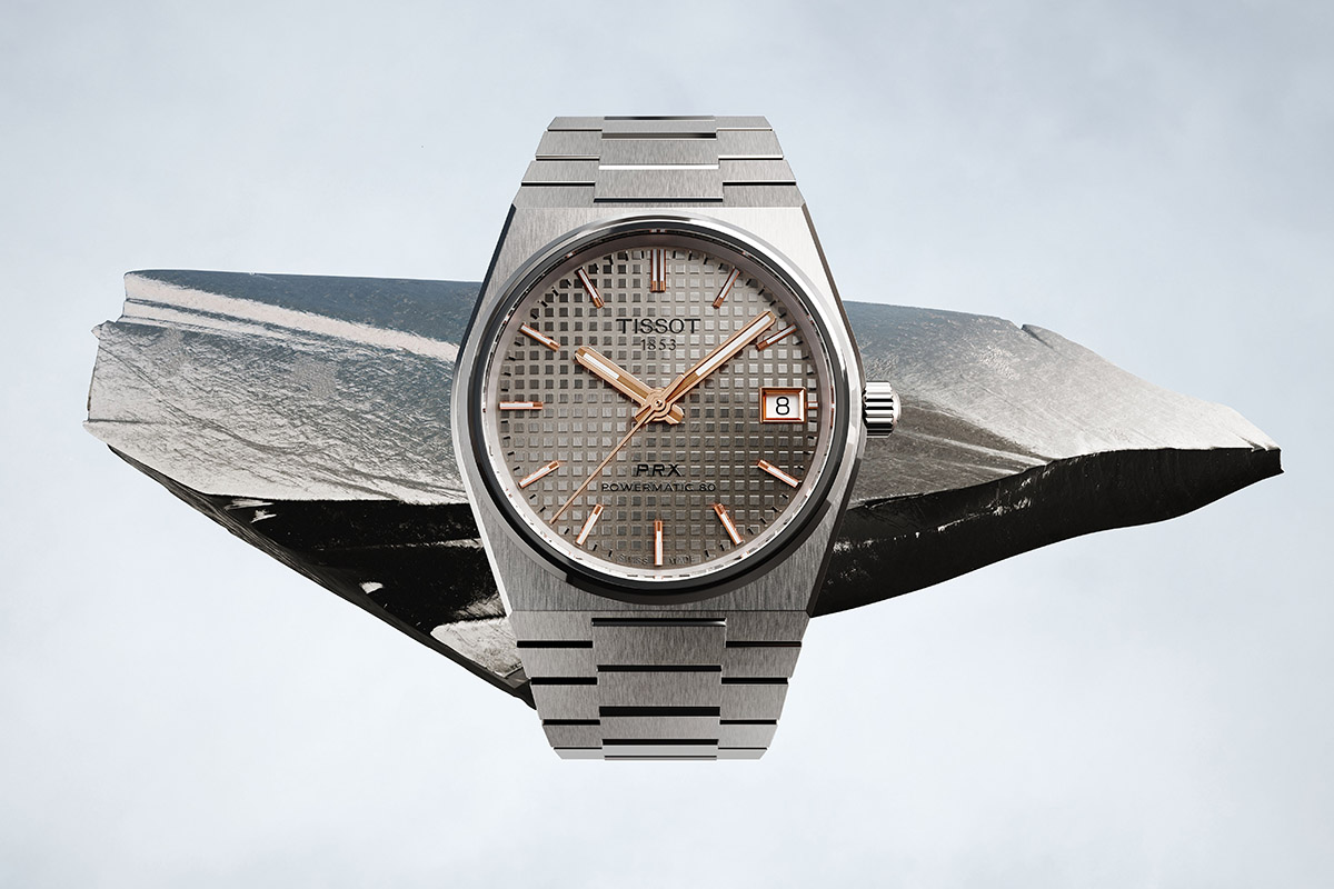 Il PRX Titanium invece ha la cassa e il bracciale integrato, come vuole la tradizione, e il quadrante coordinato, antracite, su cui spiccano lancette e indici a bastone color oro rosa. Esiste comunque anche con quadrante blu, sempre dalla lavorazione soleil e dalla stampa “a nido d’ape” (come lo definisce Tissot). Entrambi gli esemplari costano 875 euro.