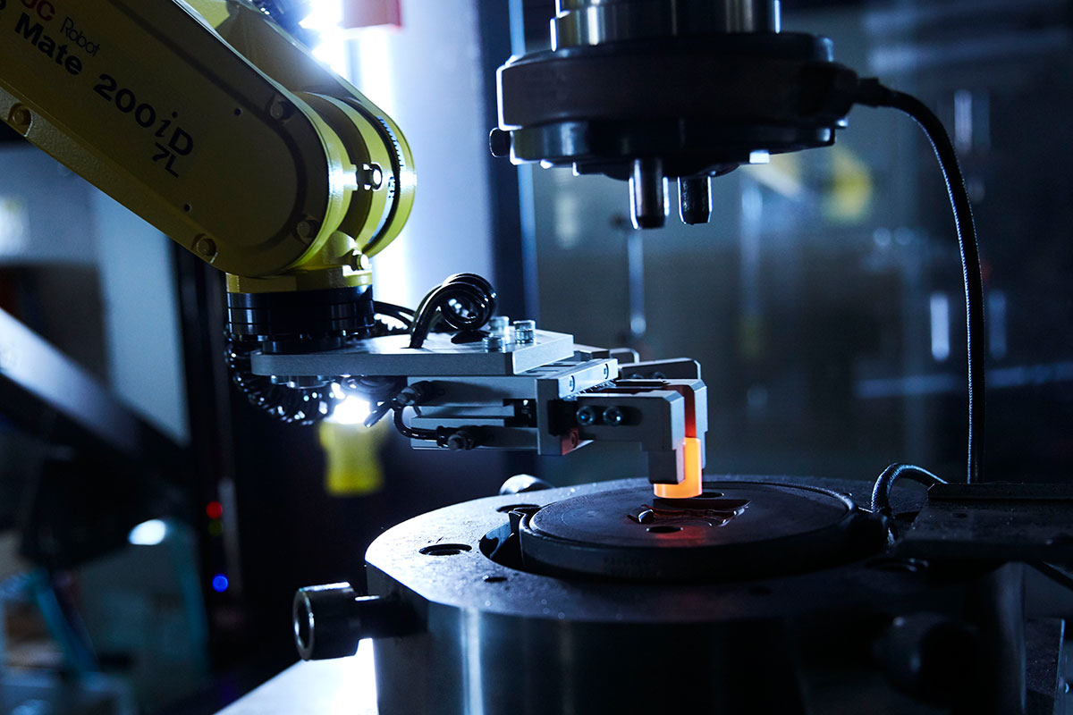 Nel processo di stampaggio, una forma viene trasferita al titanio tramite forgiatura a caldo. La gestione della temperatura e la tecnologia di rilascio dello stampo giocano un ruolo fondamentale in questa fase. Il riscaldamento del titanio ad alta temperatura ne riduce la resistenza alla deformazione e consente di stamparlo in una varietà di forme. Il metallo in eccesso si taglia per evitare che i trucioli di titanio si attacchino allo stampo. Nonostante la “pessima reputazione” del titanio, i processi di lavorazione elaborati da Citizen consentono tagli netti e precisi.