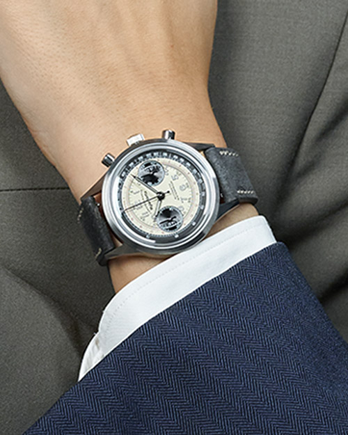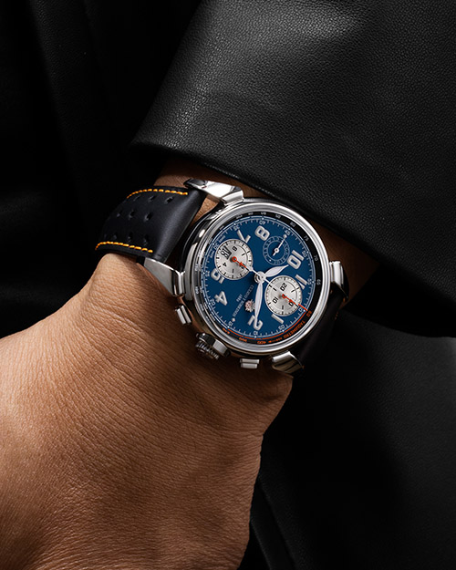 Tra heritage e modernità, un cronografo che reinterpreta un modello prodotto dal Marchio nel 1946. La cassa in acciaio misura 36 mm di diametro: dimensioni allora in voga per i polsi maschili, ma oggi decisamente trasverali ai generi. Ospita un movimento meccanico a caraica automatica, calibro ETA 2894 bicompax. Ed è declinato in tre varianti di quadrante: blu, moka oppure “panda” panna/nero, sempre con doppia schala – tachimetrica e telemetrica – lungo il perimetro. 2.700 euro.