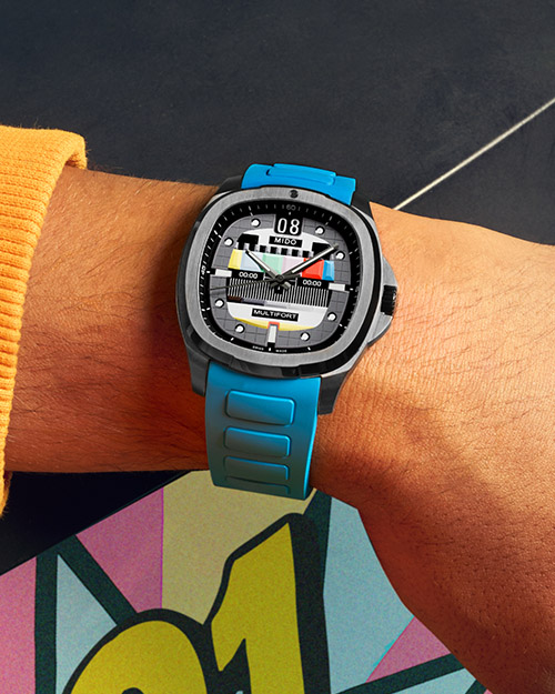 Seconda special edition che prende ispirazione dai televisori d’antan. La cassa, “a schermo tv” degli anni ’70, misura 40 mm di lato ed è realizzata in acciaio Pvd grigio satinato, mentre il quadrante richiama le barre dei test di trasmissione dell’epoca. Monta il calibro automatico Mido 80 con autonomia di 80 ore e spirale in NivachronTM antimagnetica. Si allaccia al polso con un bracciale integrato, ma il packaging include anche due cinturini intercambiabili in caucciù, blu o giallo. 1.490 euro.