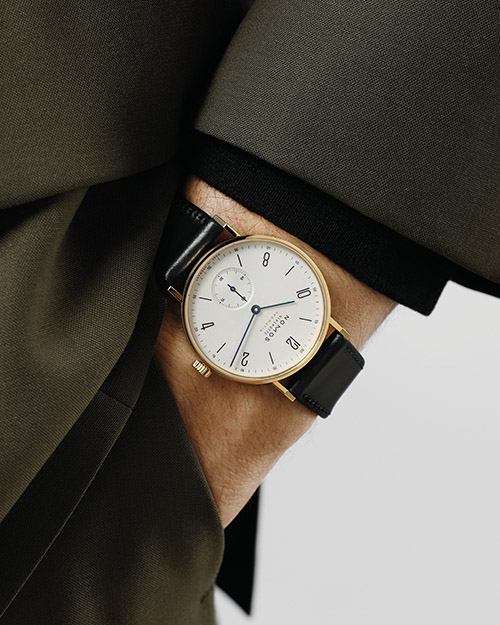 Nuova versione in oro sostenibile (riciclato e certificato Responsible Jewellery Council) del pluripremiato modello. Il design comunque rimane quello di sempre – minimalista e fedele alla tradizione Bauhaus del Marchio – così come le dimensioni misurate (35 mm di diametro, 6,9 mm di spessore). In tre versioni di quadrante: argenté lancette azzurrate, argenté con lancette dorate o in nero rutenio con lancette dorate. Il movimento è il calibro automatico DUW 3001 di manifattura, di 3,2 mm di spessore, con scappamento proprietario swing system. Prezzo non dichiarato.