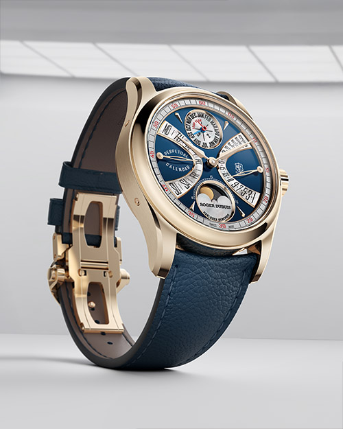 In occasione dei 30 anni della Maison, è un tributo a Monsieur Roger Dubuis e alla collezione da lui dedicata agli orologiai che hanno segnato la sua carriera. La cassa in oro rosa misura 38 mm e ospita un calibro Hommage 1472, fusione degli storici RD14 e RD72, con calendario perpetuo e indicazione bi-retrograda. Il quadrante multi-livello è laccato Blu Lemano, sfumato, e impreziosito da dettagli in madreperla e avventurina. Certificato dal Punzone di Ginevra, l’orologio è realizzato in 28 esemplari. Prezzo non dichiarato.