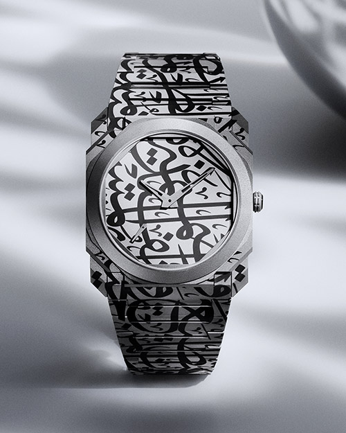 Pittore, scultore, fotografo, calligrafo, l’artista emiratino – che ha realizzato la facciata del Museo del Futuro di Dubai – reinterpreta il best-seller della Maison romana. Il risultato è un orologio in titanio sabbiato con la cassa (XX mm), il quadrante e il bracciale incisi al laser. Il movimento di manifattura, come di consueto, è il calibro BVL 138, a carica automatica e ultrapiatto (2,23 mm di spessore), con micro-rotore decentrato in platino e 60 ore di autonomia. Edizione limitata di 70 esemplari. 23mila euro.