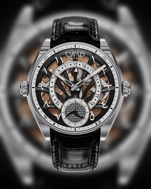 Il nome – che in arabo significa “essenza” – riflette la filosofia dell’orologio, sintesi di design contemporaneo, tradizionale savoir-faire e identità culturale araba. Nella cassa (42 mm) in titanio grado 5 monta il calibro automatico CYR708, di manifattura, con platina in oro rosso 5N, ponte superiore color antracite a forma di palma e 55 ore di autonomia. Il quadrante interamente scheletrato riporta le cifre in arabo su un disco in vetro zaffiro, l’indicazione del secondo fuso orario con lancetta ad andamento retrogrado (sempre con le cifre in arabo) e i piccoli secondi a forma di logo. Edizione limitata di 28 esemplari, 24.800 franchi svizzeri (tasse escluse).