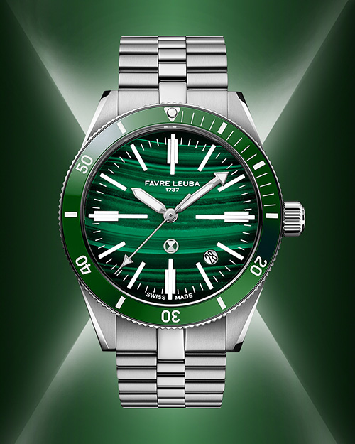 L’estetica deriva dal Deep Blue del 1964, reinterpretata con successo lo scorso anno. Ma per la prima volta (nella storia non solo della collezione, ma dell’intero brand) il quadrante è in pietra dura: in questo caso malachite, ma esiste anche in meteorite. La vocazione subacquea comunque resta immutata: la cassa (40 mm) in acciaio è sempre impermeabile fino a 30 atm e ha la ghiera unidirezionale girevole in ceramica. Anche il movimento automatico rimane il calibro FLD02 (base La Joux-Perret G100), con 68 ore di autonomia. Con bracciale in acciaio costa 2.800 franchi svizzeri.
