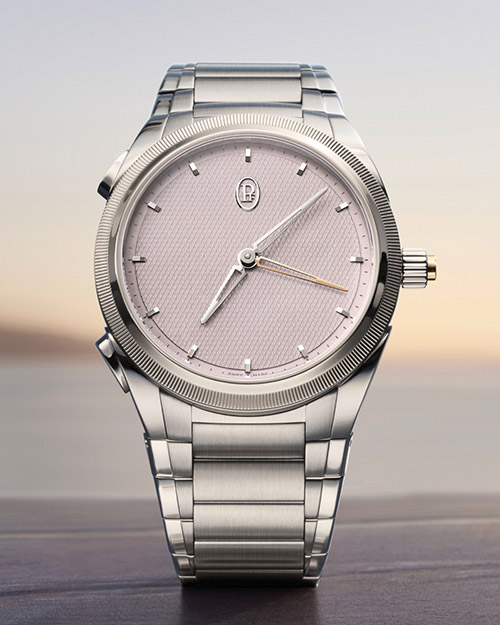 PARMIGIANI FLEURIER Tonda PF Minute Rattrapante Acciaio Artic Rose Lanciata nel 2023, la complicazione del minuto sdoppiante, inventato dalla Maison, si veste di una nuova tonalità. Il rosa pallido del quadrante si rifà alla tradizione del XVIII secolo, che lo voleva come colore tipicamente maschile, ma qui è ricco di riflessi cangianti grazie al guilloché grain d’orge. Quanto al resto, rimane immutato: la cassa (40 mm) in acciaio con bracciale integrato, la lunetta zigrinata in platino, le lancette scheletrate. Il movimento è il noto calibro PF052 di manifattura, a carica automatica, con micro-rotore decentrato in oro rosa e finiture d’alta gamma. 29.700 franchi svizzeri.