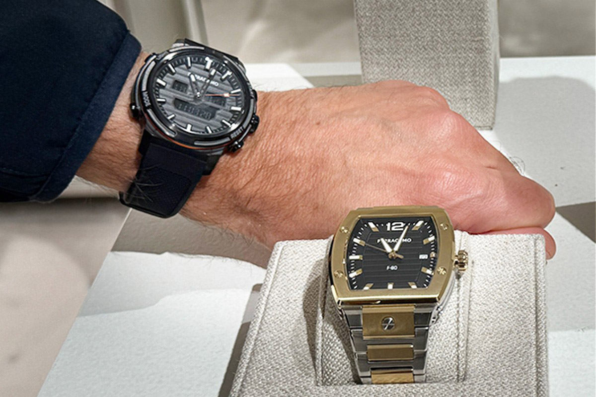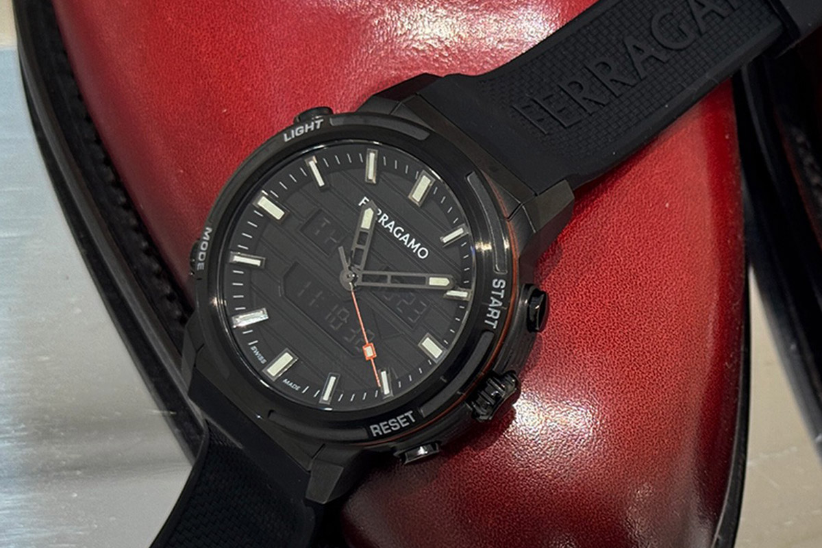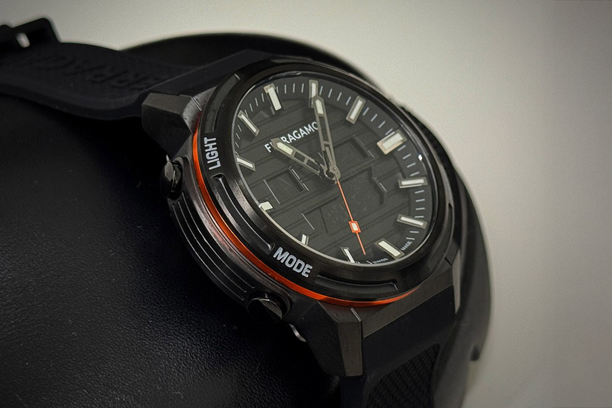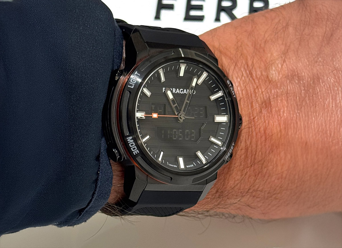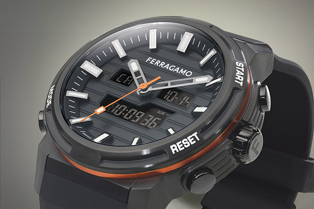 Basta dire ana-digi e il pensiero corre subito a certi orologi di culto del passato. Per esempio l’Omega Polaris o il primo Breitling Aerospace, due esemplari usciti negli anni Ottanta e rimasti nella memoria collettiva come simbolo di quel decennio. All’epoca, il mondo delle lancette vedeva i movimenti al quarzo, emblema di tecnologia d’avanguardia, in piena ascesa per precisione e affidabilità. E i modelli dal doppio display, analogico e digitale, sembravano la sintesi ideale del vecchio e del nuovo, dell’orologeria meccanica e dell’innovazione elettronica. A questa tradizione guarda il Ferragamo Sport Anadigit, un nuovo sportivo che va ad arricchire il catalogo della Maison.