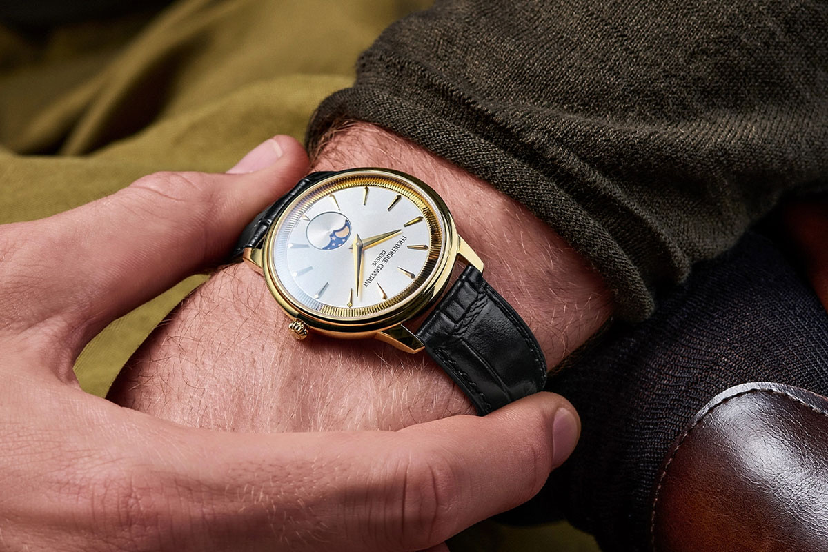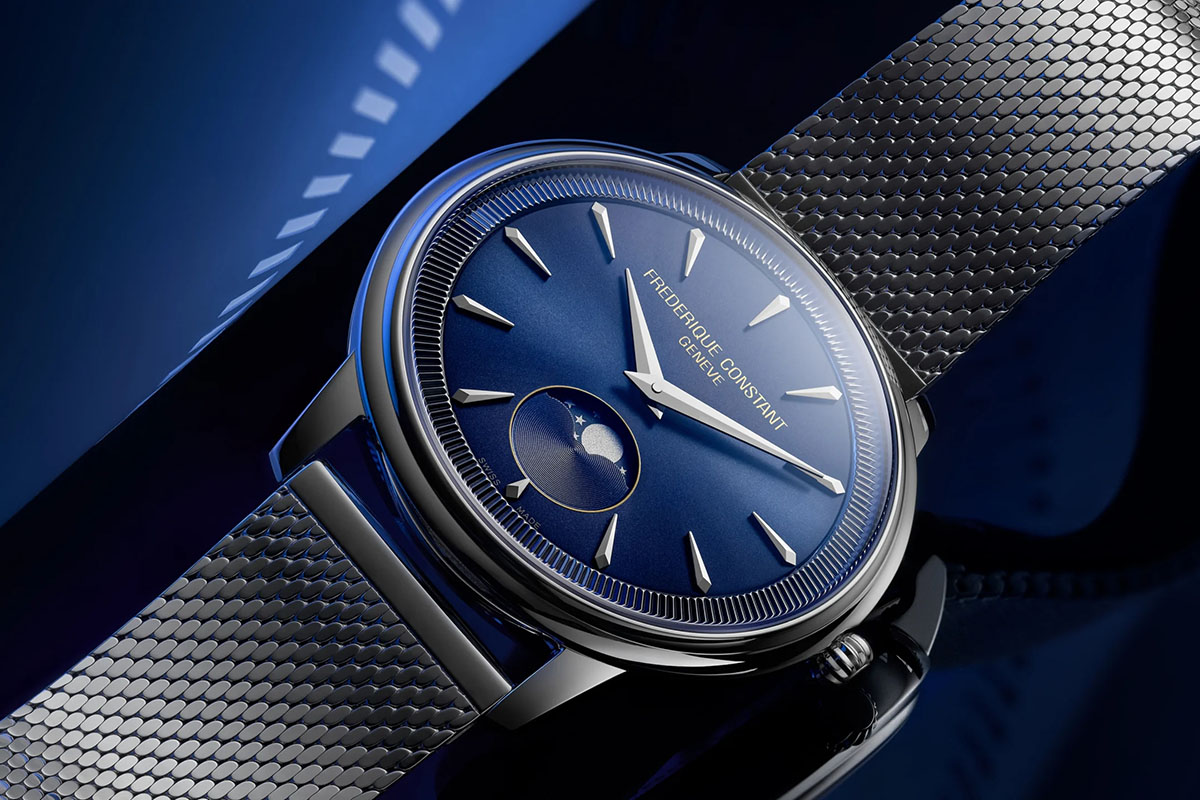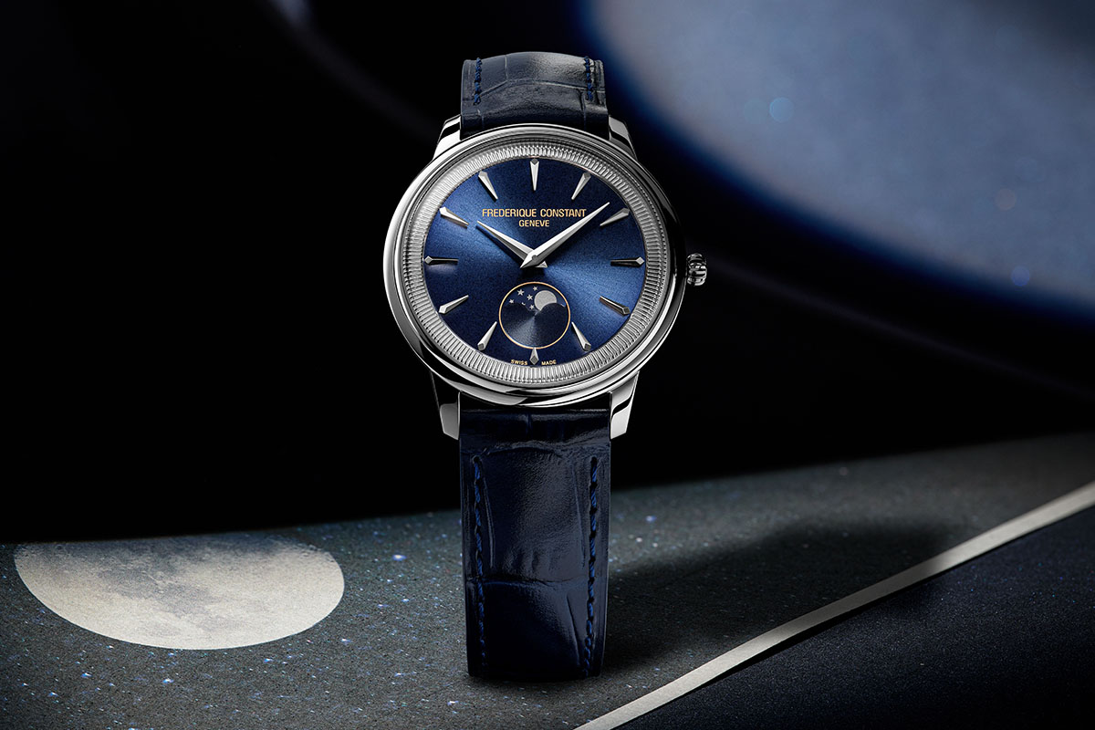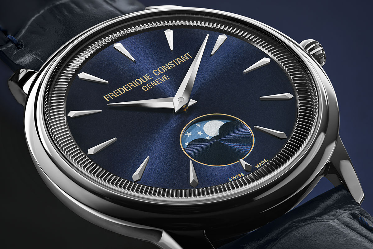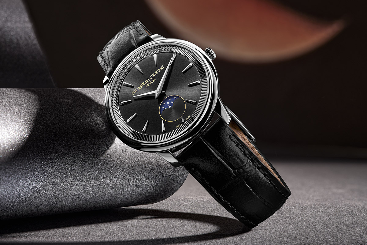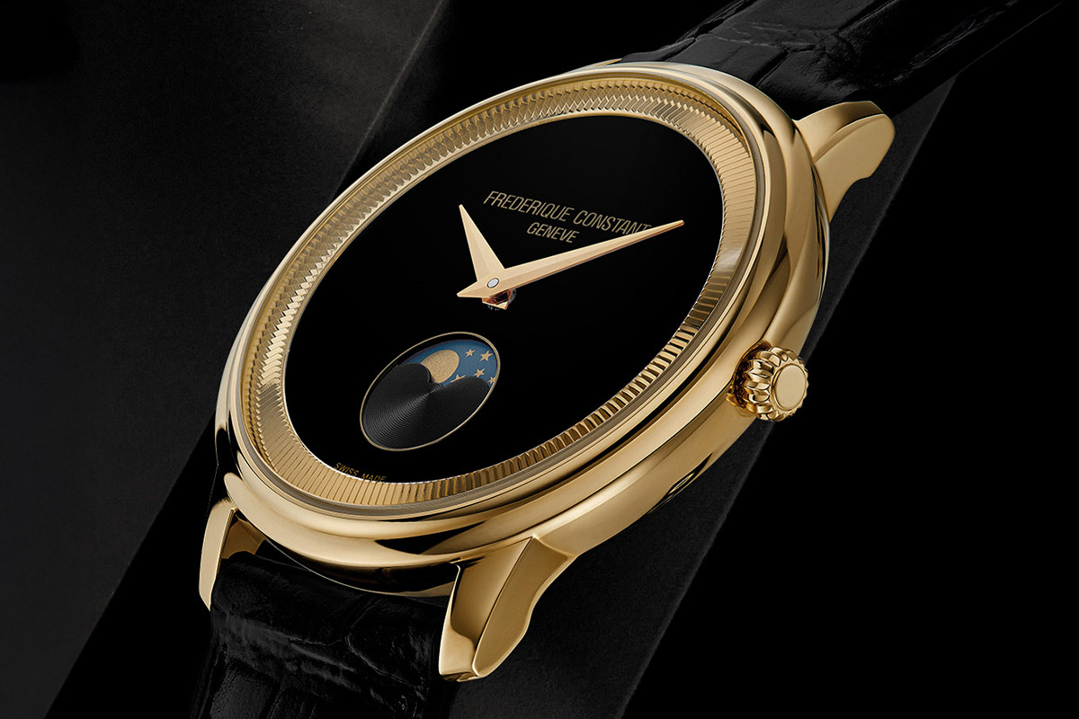 Il Classics Moneta Moonphase appare sul mercato a settembre dello scorso anno. Frederique Constant lo presenta in tre versioni, con la cassa in acciaio di 37 mm di diametro e il quadrante soleil in colori diversi: argenté, blu oppure nero. Ritorna poi, ai Geneva Watch Days di quest’anno, in altre due variazioni sul tema: di nuovo con il quadrante blu ma interamente in acciaio, con il bracciale in maglia milanese, a riecheggiare un certo gusto d’antan; e con la cassa Pvd oro giallo, più luminosa, che evoca una preziosità materica. Infine eccolo di nuovo alla Dubai Watch Week appena conclusa, sempre con la cassa nella tonalità più calda dell’oro ma con il quadrante nero, a creare un efficace e distintivo contrasto.