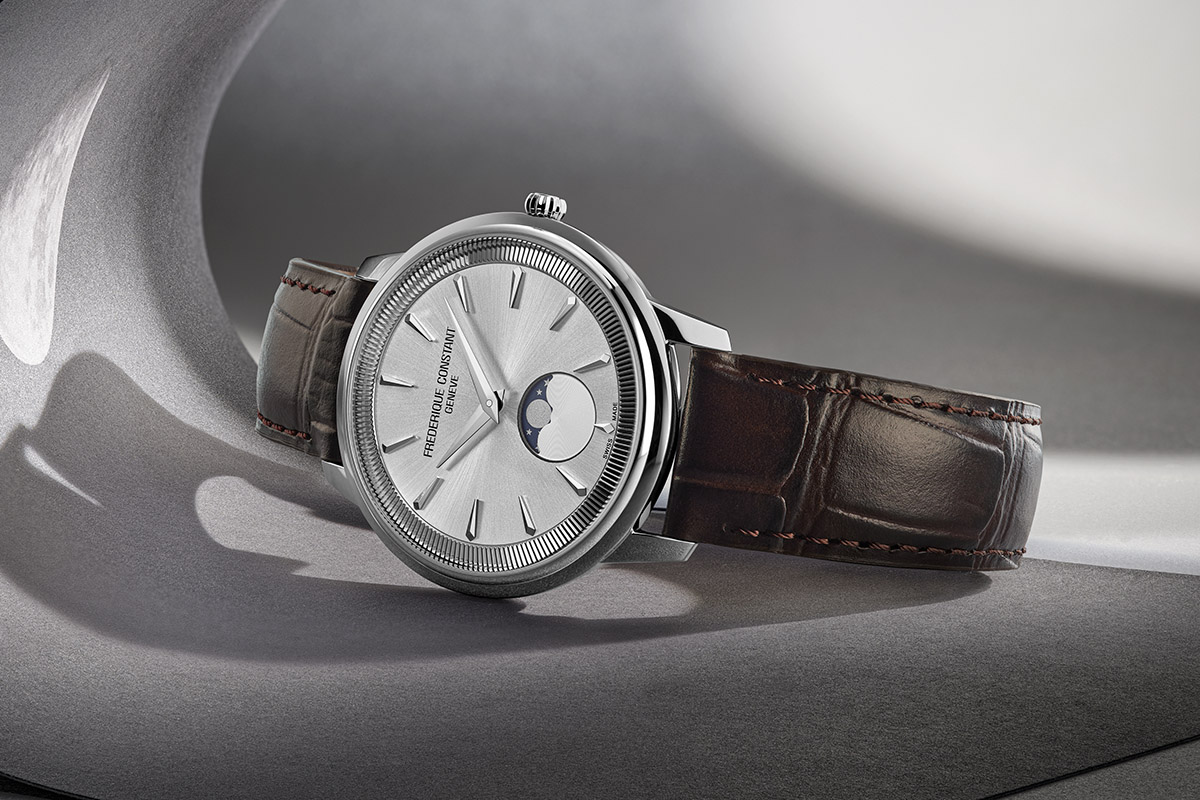 Dimenticatevi i Coin Watch. Il Classics Moneta Moonphase di Frederique Constant si chiama così in tutte le lingue. E non perché è inserito nel denaro metallico di qualche valuta, magari fuori corso, in metallo più o meno prezioso. Prende nome invece da un dettaglio speciale, che lo rende davvero originale e unico: una seconda lunetta interna zigrinata, applicata nello spazio del réhaut, fatta proprio come il bordo di una moneta. Se poi ci aggiungete la cassa rotonda e lo spessore sottile, vi sarà chiaro che l’appellativo è quanto di più azzeccato si potesse trovare.