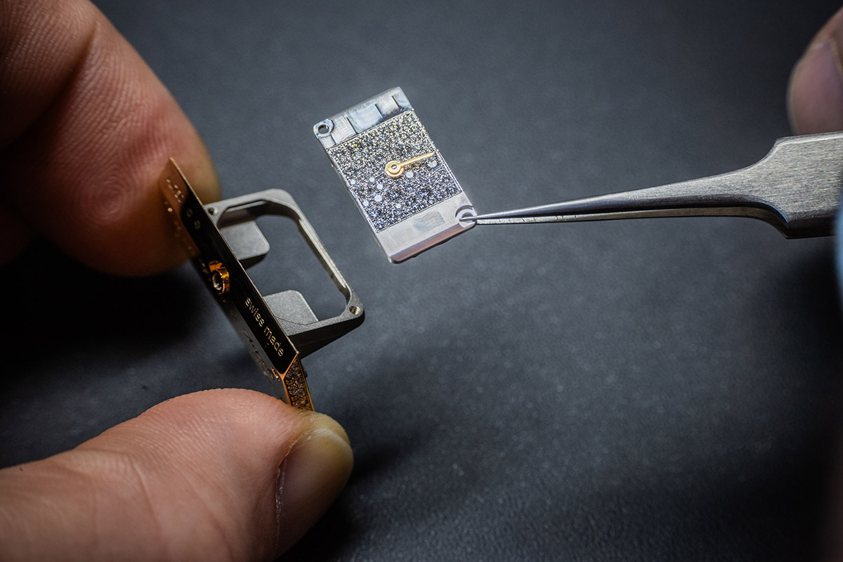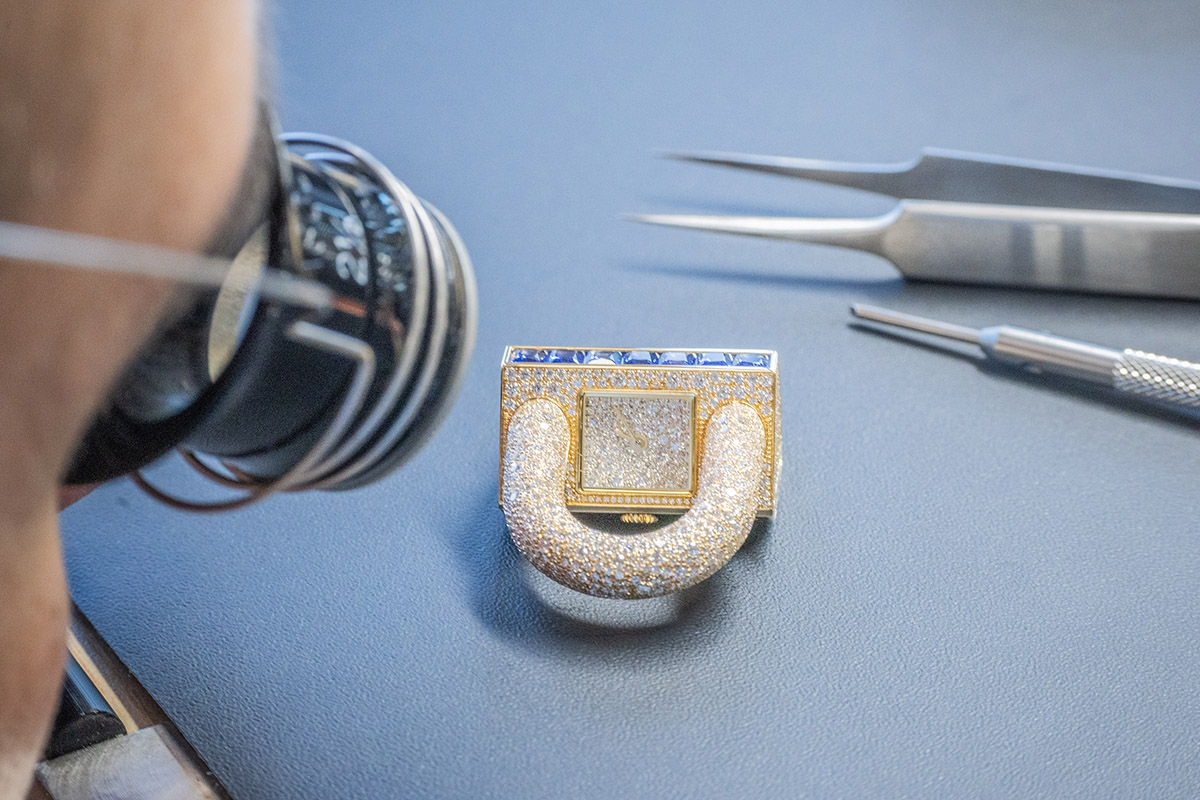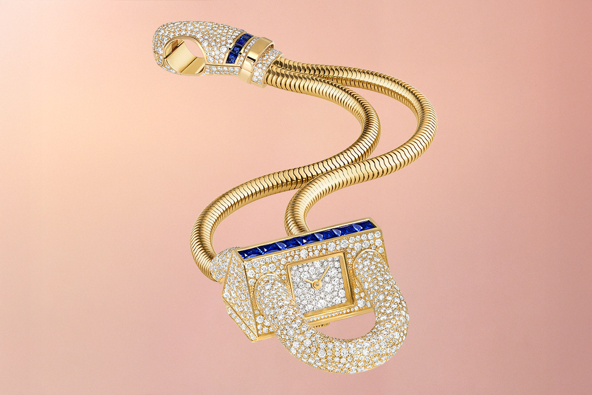 Fedele all’estetica originaria, Van Cleef & Arpels quest’anno ha dato al Cadenas una nuova veste preziosa. Interamente in oro giallo, abbina alla cassa con pavé di diamanti incastonati a neve una fila di zaffiri taglio princess e il bracciale a serpentina. Il luminoso accostamento cromatico è ripreso sul fermaglio, a sua volta decorato da una linea di zaffiri taglio carré per poi “soccombere” allo splendore dei diamanti che trionfano, illuminandolo, nel quadrante in oro bianco.