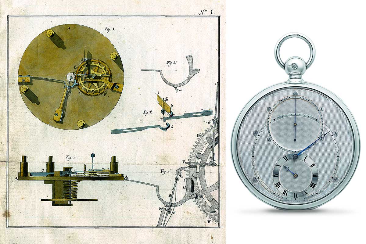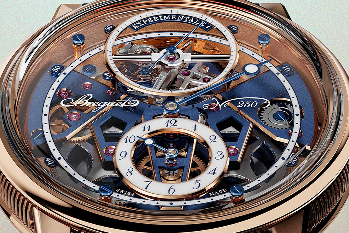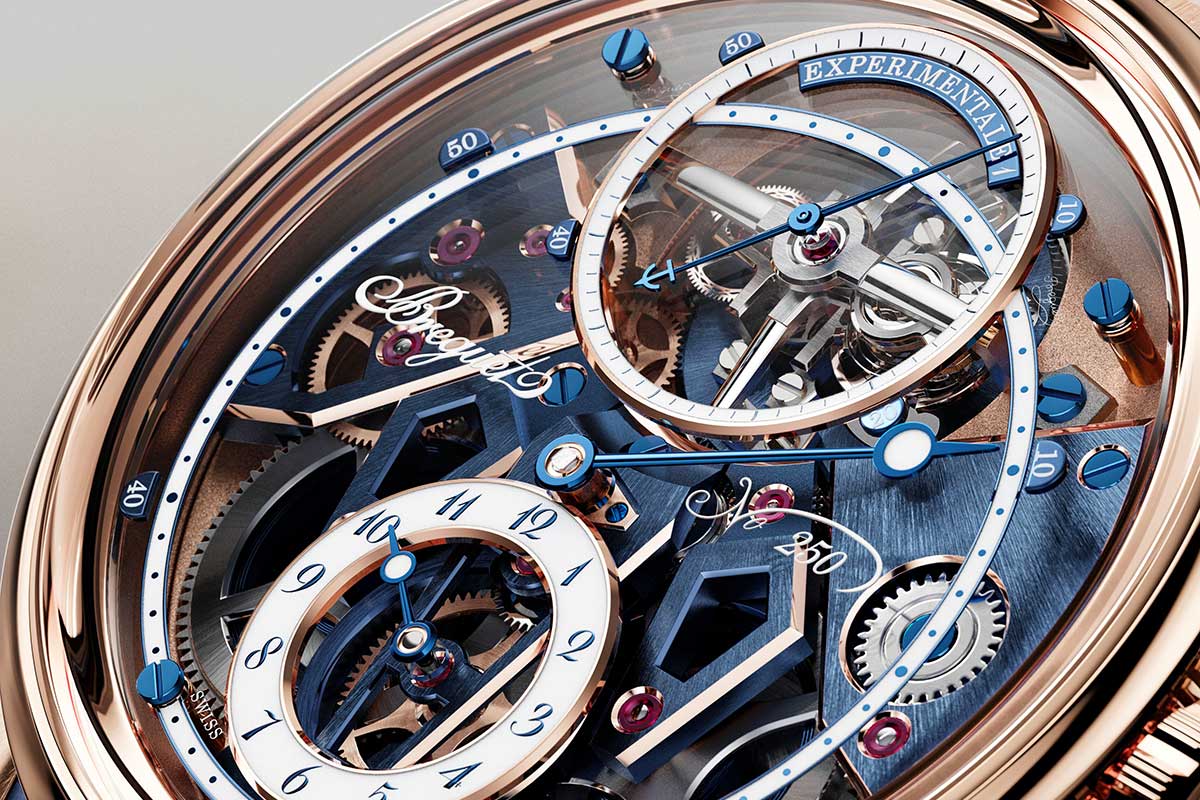 Chi conosce un minimo la storia di Breguet, vedrà nell’Expérimentale 1 l’estetica dell’orologio da tasca n. 3448 con visualizzazione delle ore in stile regolatore. Le affinità con il modello antico però finiscono qui, perché il quadrante anziché essere in smalto è in un modernissimo zaffiro. La distribuzione dei contatori è all’insegna dell’equilibrio estetico, con la parte alta in cui spicca il tourbillon, bilanciato dal contatore delle ore nella parte bassa. A destra e a sinistra si vedono i bariletti gemelli del Calibro 7250, montati in serie.