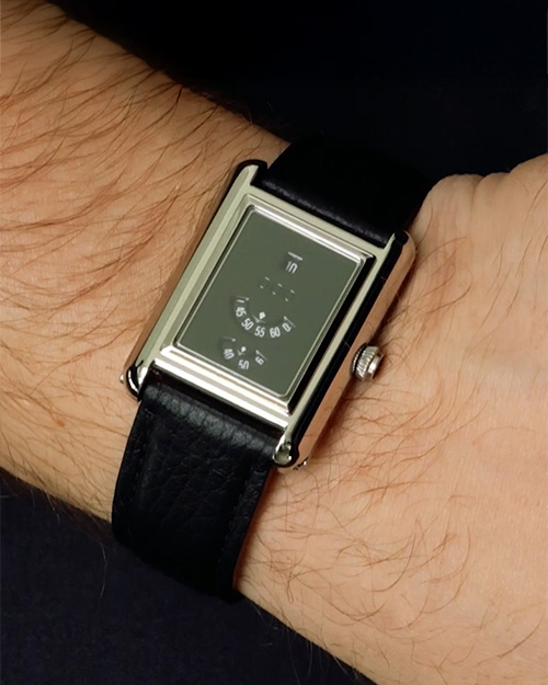 Il precedente è il modello Montre sans Aiguilles lanciato da Gerd-Rüdiger Lang nel 2005. Ma se il mood è simile, in realtà, l’orologio è stato completamente riprogettato. Cassa in acciaio dalle proporzioni attuali, 40 x 30 mm, e movimento meccanico a carica manuale, calibro C.85757, sviluppato su base Peseux, che riporta anche i secondi continui. Due le versioni, con lo sfondo del quadrante color granito oppure sabbia, ciascuno in edizione limitata di 99 esemplari. 13.800 euro.