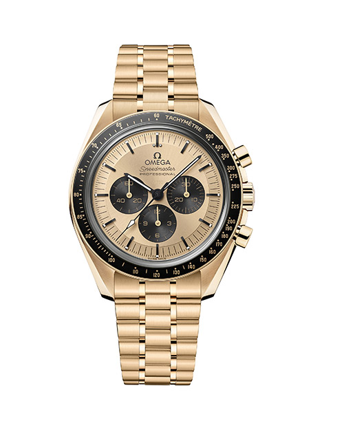 Omega Speedmaster Moonwatch Professional. Cassa (42 mm) in oro Moonshine™. Movimento meccanico a carica manuale, calibro 3861, cronografo con scappamento Co-Axial, spirale in silicio e secondi continui; certificato Master Chronometer dal Metas. Lunetta in ceramica nera. (Spilla Dolce & Gabbana).