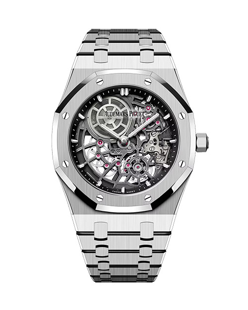 Audemars Piguet Royal Oak Jumbo Extrathin Openworked. Cassa (39 mm) e bracciale in oro bianco. Movimento meccanico a carica automatica, calibro 7124, ultrapiatto (2,7 mm di spessore) e scheletrato. (Spilla e anelli, Boucheron).