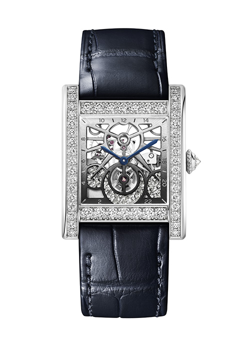 Cartier Privé Tank Normale Squelette. Cassa (27,8 x 35,2 mm) in platino. Movimento meccanico a carica manuale, calibro 9628 MC, scheletrato e con funzione giorno/notte. Lunetta, corona e fibbia con con diamanti (2 ct circa). Edizione limitata di 20 esemplari.