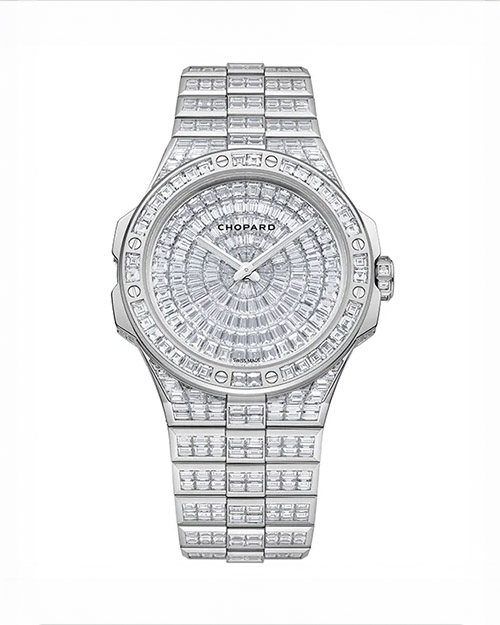 Chopard Alpine Eagle 41 XP Frozen Summit. Cassa (41 mm) e bracciale in oro bianco etico con 29,02 carati di diamanti taglio baguette. Movimento meccanico a carica automatica, ultrapiatto, calibroL.U.C 96.41-L, con doppio bariletto. Certificato dal Punzone di Ginevra. (Spilla e anello, Chopard).