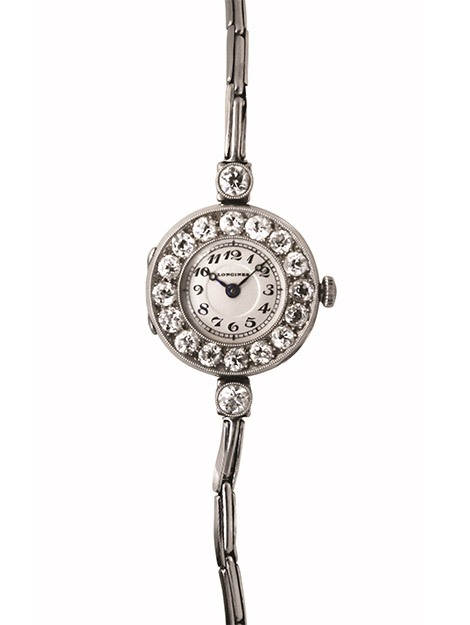 Longines Vintage. Cassa XS e bracciale in platino. Movimento meccanico a carica manuale d’epoca. Lunetta con diamanti taglio brillante. Pezzo unico, 1916.