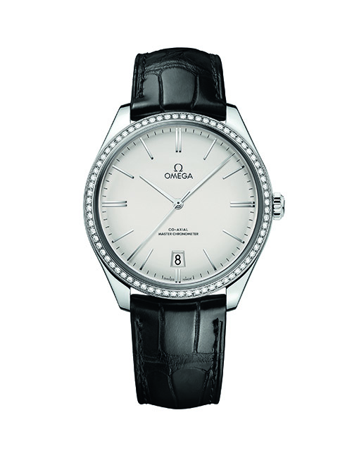 Omega De Ville Trésor. Cassa (40 mm) in acciaio. Movimento meccanico a carica manuale, calibro 8910, con scappamento Co-Axial, autonomia di 3 giorni e piccoli secondi; certificato Master Chronometer dal Metas. Lunetta con diamanti.