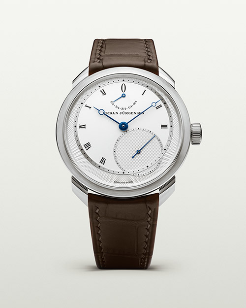 Urban Jürgensen UJ-2. Cassa (39 mm) in platino. Movimento meccanico a carica manuale, calibro Calibro UJ-2, con scappamento diretto a doppia ruota, indicazione dell’autonomia piccoli secondi. (Collana e anello, Cartier).