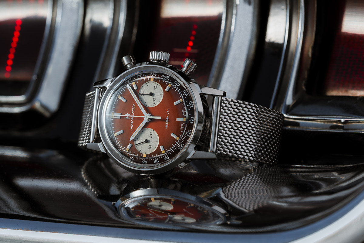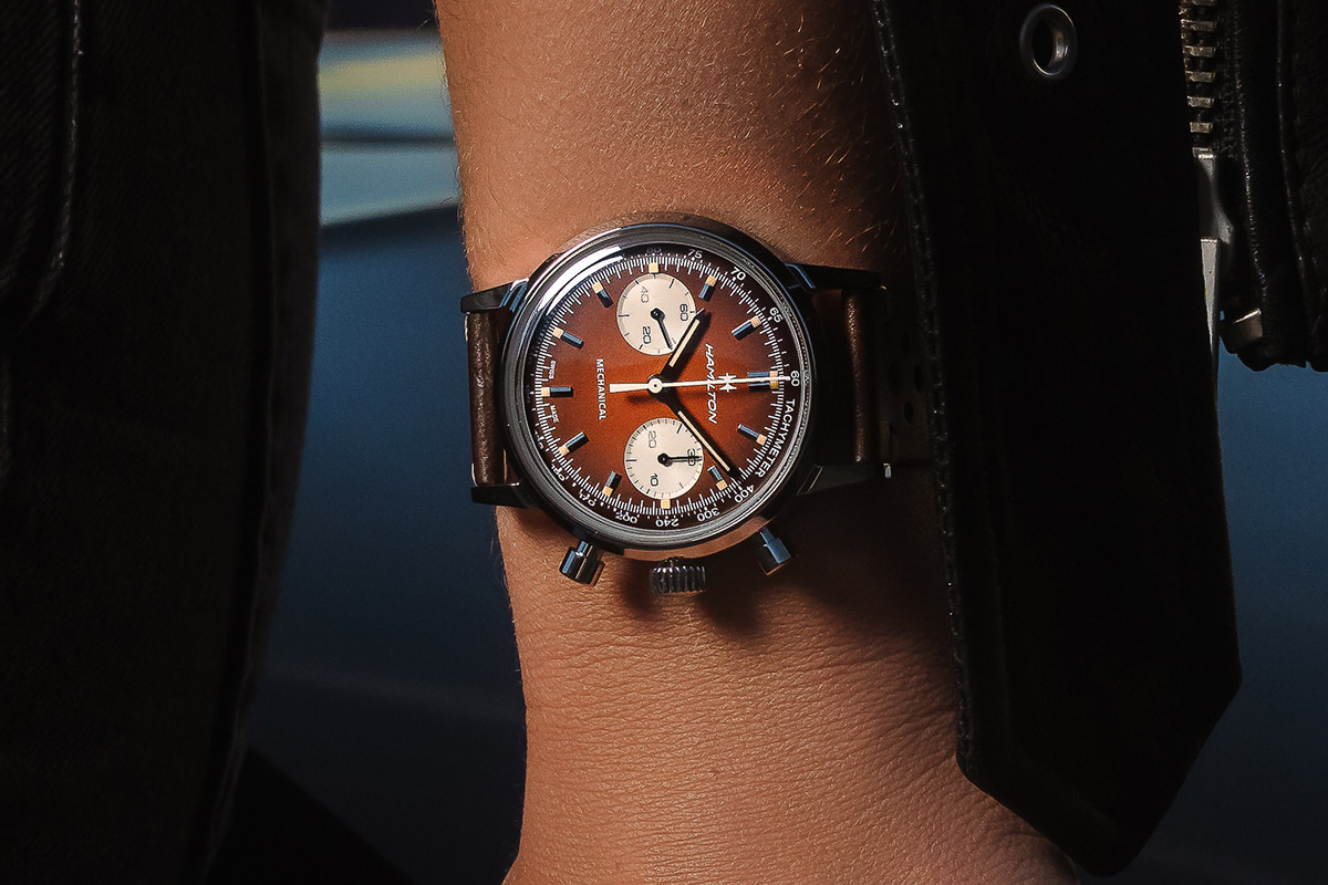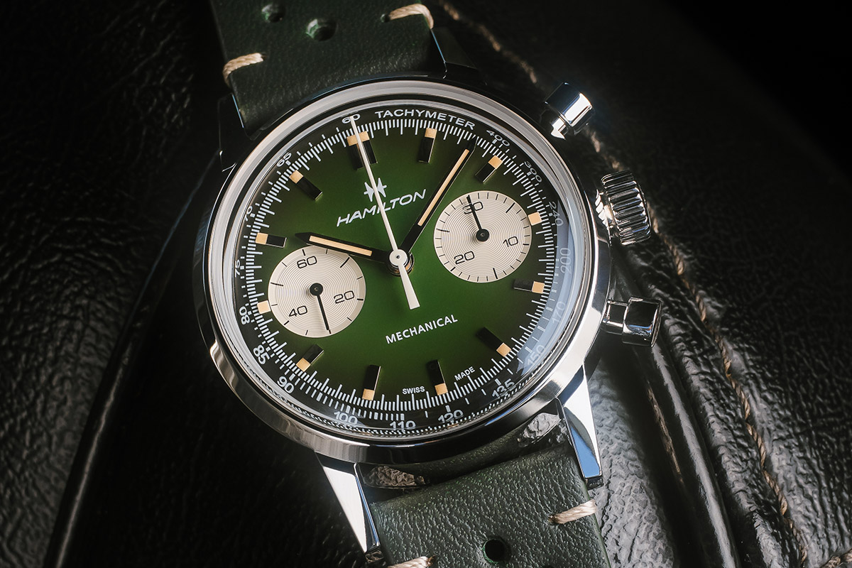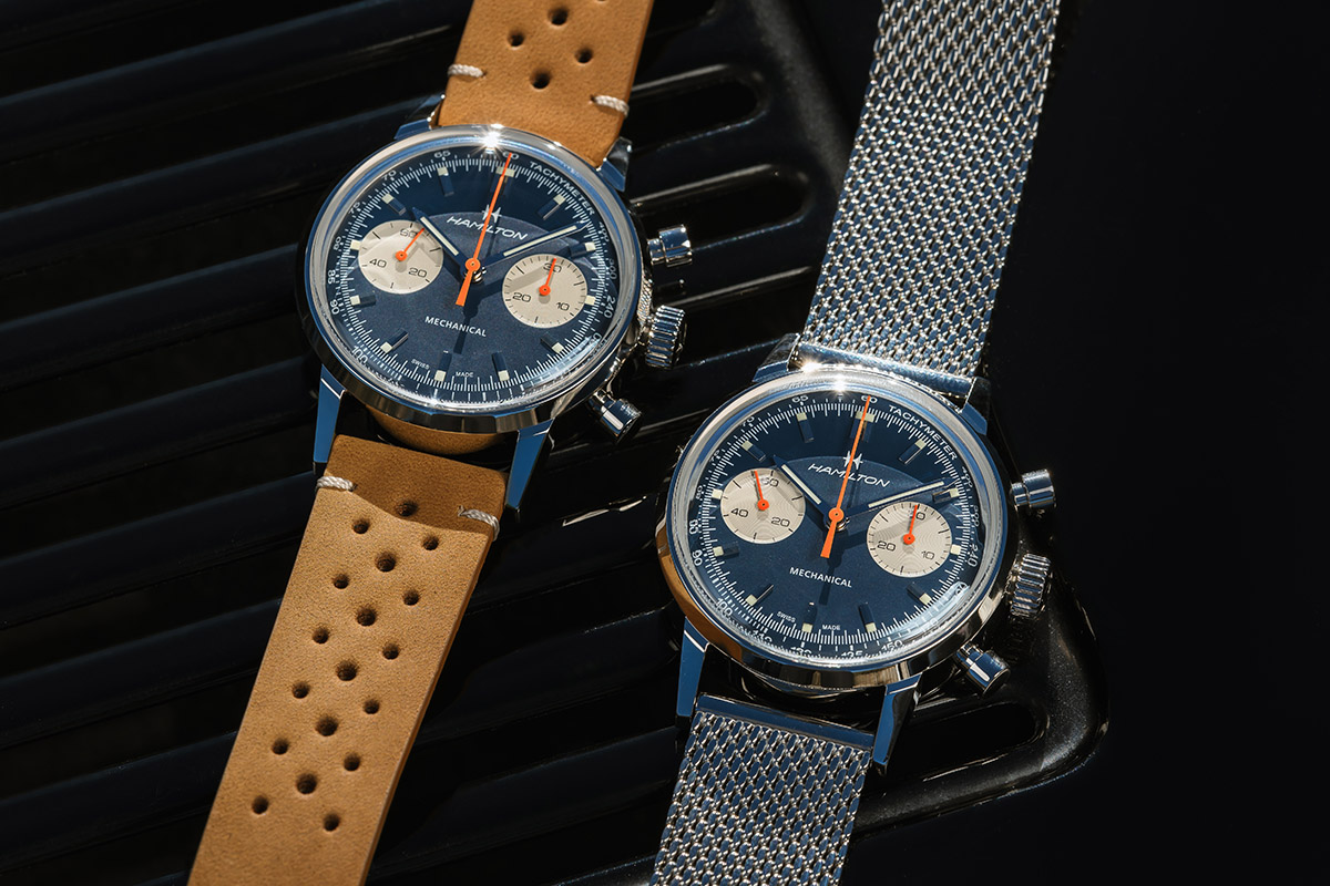 Dire Intra-Matic significa ripercorrere un pezzo di storia dell’orologeria. Tornare agli anni Sessanta, agli albori dei cronografi automatici, all’acquisizione di Büren da parte di Hamilton, al Progetto 99 del consorzio Chronomatic. Fast Forward, con il proposito di tornare presto sull’argomento. Nel 2012 Hamilton ha riportato in vita l’Intra-Matic come linea di solo tempo, poi evoluta nel 2017 in un cronografo a carica manuale e ulteriormente sviluppata nel 2021. Oggi la collezione si chiama Hamilton American Classic Chronograph H, in riferimento ai Chronograph A e B del 1968 e alla famiglia di “grandi classici” d’Oltreoceano presente in catalogo. La stessa, per intenderci, in cui si trovano anche i PSR (i discendenti del Pulsar), e i vari Boulton o Ardmore di ultima generazione.