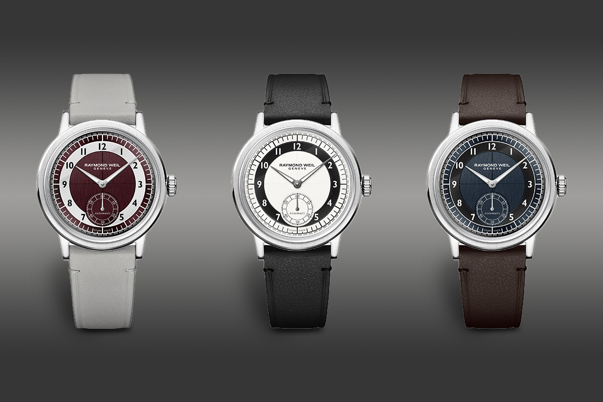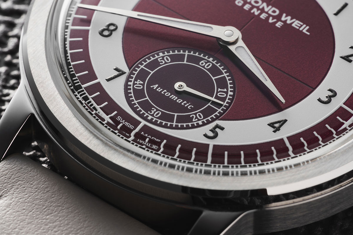 Il fatto che abbiamo anticipato il Raymond Weil Millesime Small Seconds Tuxedo Dial nelle Latest di una decina di giorni fa e che oggi ne scriva più estesamente dovrebbe farvi intuire che, per noi, si tratta di un orologio che vale la pena raccontare. Intanto perché, come ho scritto poco sopra, dà del quadrante tuxedo un’interpretazione personale. Al classico bianco e nero, Raymond Weil affianca una versione in cui abbina il centro del quadrante blu all’anello della minuteria nero e un’altra in cui il centro bordeaux (vinaccia, lo chiama l’azienda) fa il paio con la periferia bianca.