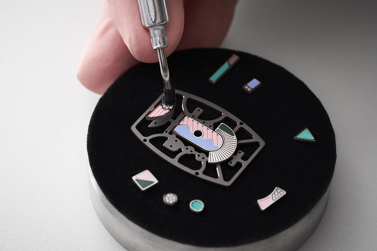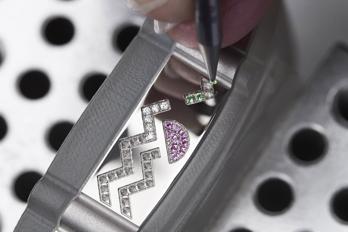 Altri diamanti e pietre di colore dal formato ridotto sono poi montati sulla carrure in oro bianco, anche qui posizionati in modo da creare decorazioni geometriche. Nel metallo nobile per eccellenza, chiaramente, l’incastonatura avviene in modo tradizionale – con il mitraillage e la creazione dei grani direttamente nel metallo – senza troppe difficoltà se non quelle create proprio dalle dimensioni delle gemme. E dalla loro quantità, che dev’essere molto elevata.