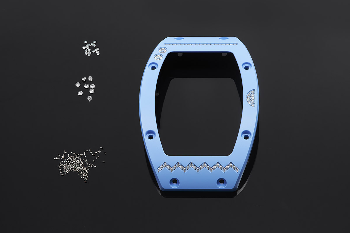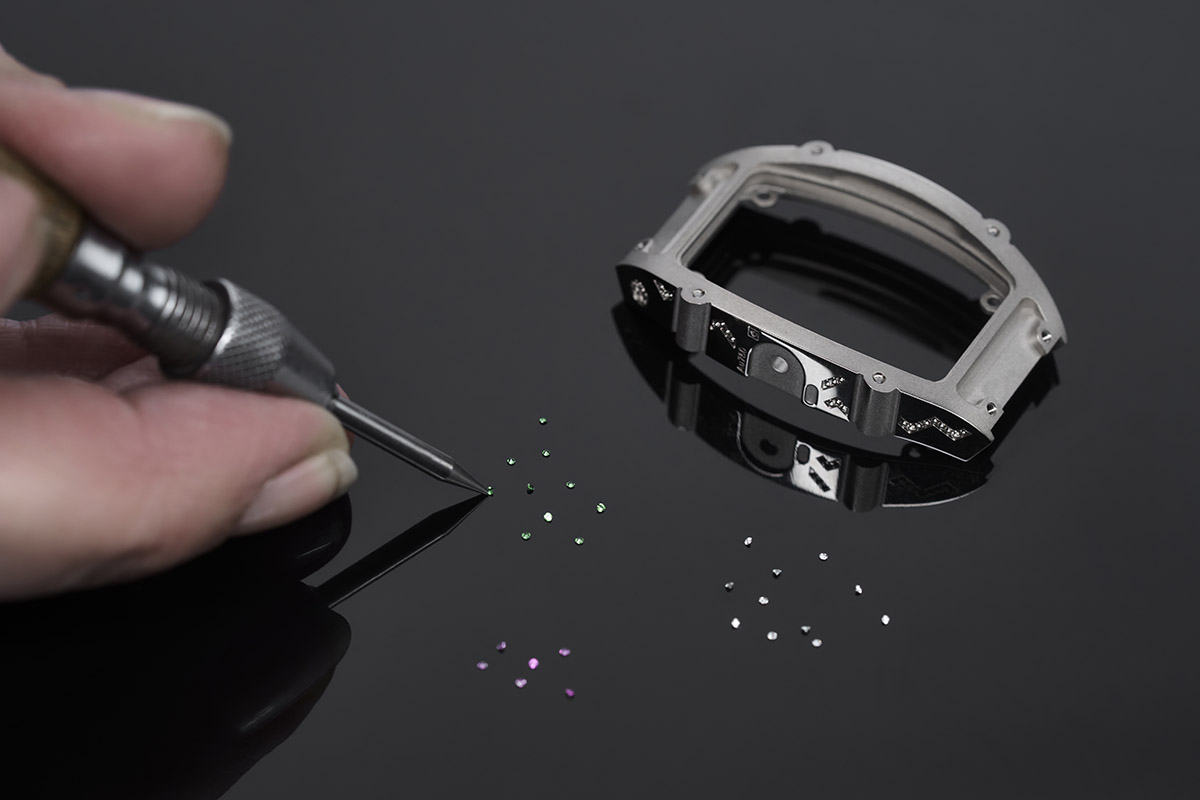 Bene. Veniamo al problema dell’incastonatura delle pietre preziose nella ceramica. Proprio perché si tratta di un materiale particolarmente duro, non è possibile montarle con metodi tradizionali. I progettisti della ProArt, la fabbrica di Richard Mille dedicata alla produzione di casse in materiali high-tech, hanno quindi dovuto mettere a punto una particolare tecnica, basata sul cosiddetto mitraillage (mitragliamento, in francese). Ovvero l’esecuzione di una serie di micro-fori o cavità in cui alloggiare le gemme, che tradizionalmente è eseguito a mano nel metallo con appositi bulini o piccole frese.