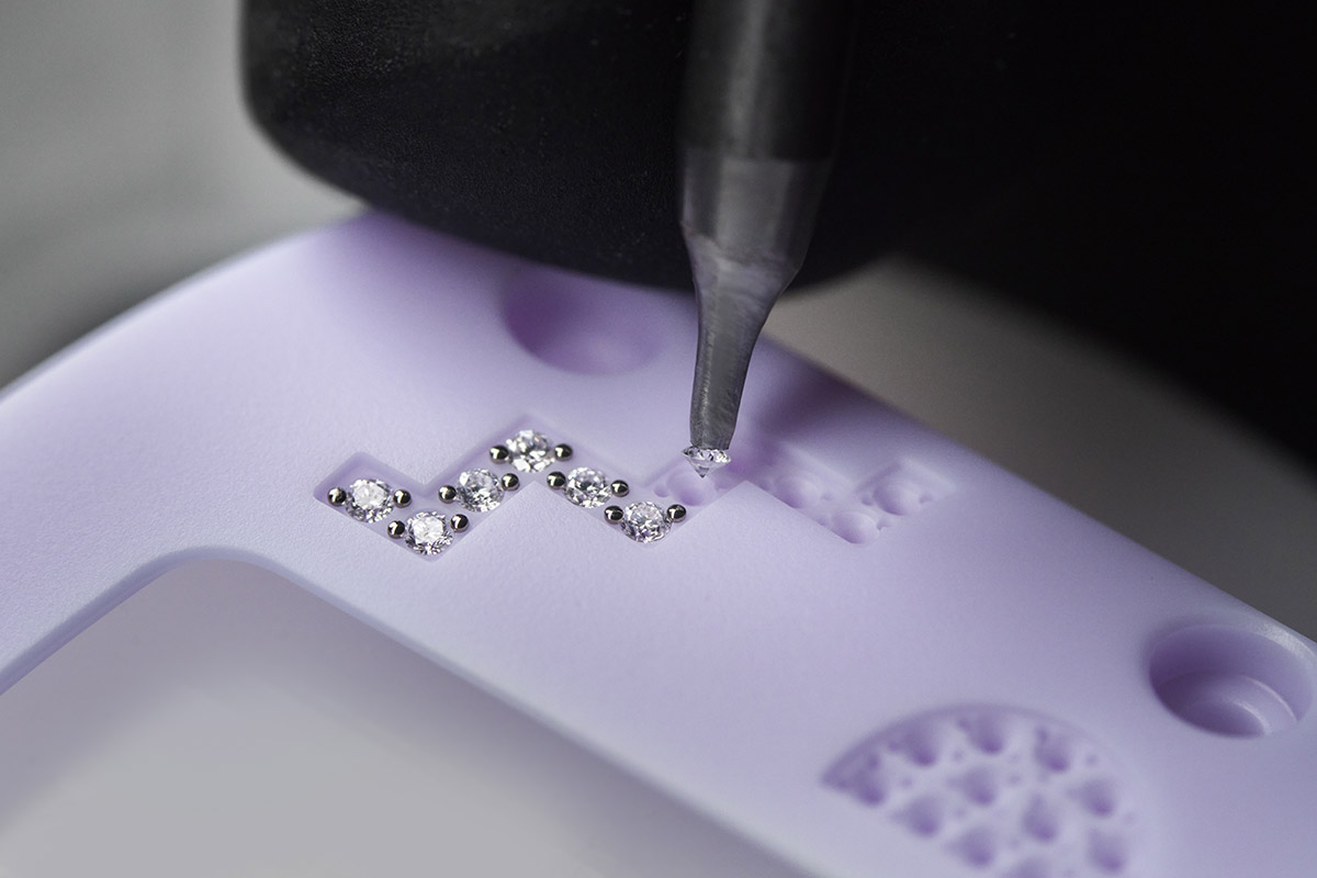 Qui però, vista la durezza della ceramica, il mitraillage dev’essere effettuato con macchine CNC a 5 assi, che permettono una precisione micrometrica e una perfetta perforazione del materiale. E con pietre così piccole collocate in figure così definite, la precisione è fondamentale. Anche perché in questo caso è impossibile ricavare i grani che serviranno a tenere in sede le pietre (di solito l’incastonatore li scava e li solleva direttamente dal metallo circostante). Di conseguenza, oltre ai fori di alloggiamento delle gemme, bisogna crearne altri – proprio accanto, nell’esatta posizione – che ospiteranno i castoni metallici necessari a bloccare le gemme.