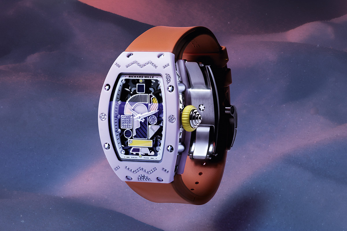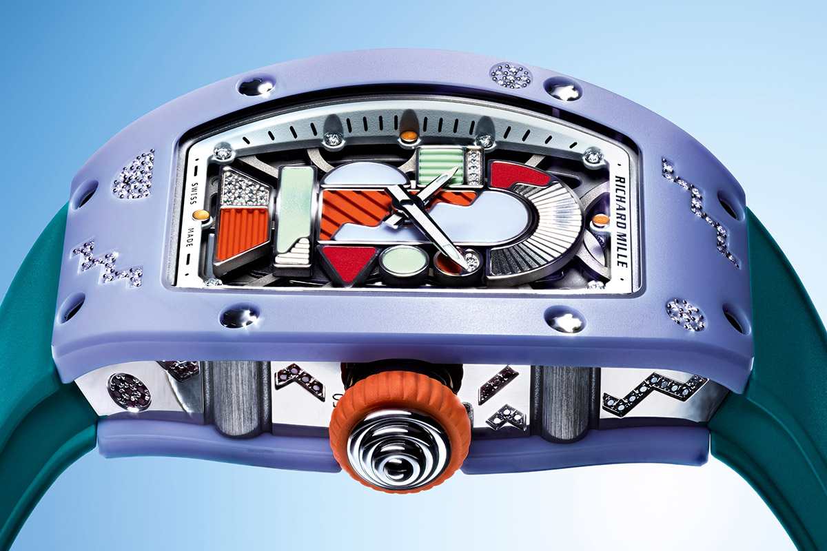 Per passare al display, come nelle versioni precedenti anche i nuovi RM 07-01 Ceramiche Colorate hanno il quadrante decorato da figure geometriche. Sulla piastra di oro rosso 5N rodiato e scheletrato si trovano frammenti di ceramica colorata, applicazioni in gomma tagliata al laser, piastrine in oro bianco tempestate di pavé di diamanti (sempre con pietre piccolissime), archi e segmenti in oro guilloché. Il risultato è un puzzle astratto e coloratissimo – dalle cromie a contrasto -, accentuato anche dal cinturino in caucciù.