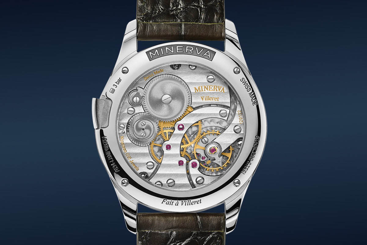 Per questo orologio, Minerva ha scelto una frequenza piuttosto bassa, 18.000 alternanze/ora, abbinata però a un’autonomia sontuosa di 80 ore, resa possibile da una spirale molto estesa, come lasciano intuire le dimensioni del bariletto. Il calibro M15.08 è infatti visibile attraverso il fondello in vetro zaffiro e caratterizzato da una sorta di firma estetica della Maison: sull’organo regolatore è infatti visibile un elemento a forma di freccia, il logo storico di Minerva.