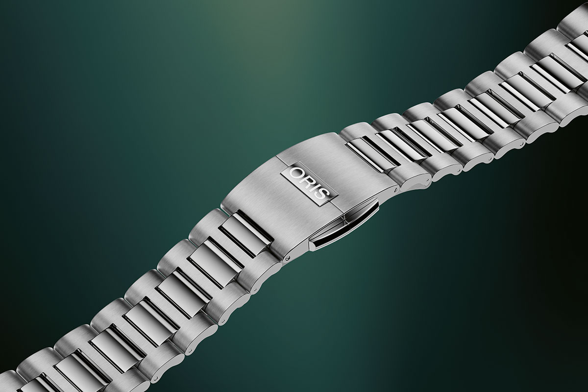 Per il quadrante dell’Artelier Complication, Oris propone tre varianti di colore: avorio, blu o marrone castagna. La cassa in acciaio ha un diametro contemporaneo, 39,5 mm, e uno spessore contenuto, 11,8 mm. La distanza tra ansa e ansa (45,5 mm) e le anse piuttosto corte dovrebbero garantire una buona vestibilità sulla maggior parte dei polsi.