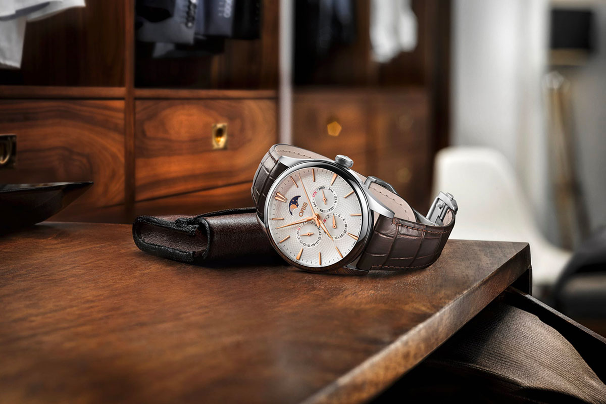 Datario “pointer”, cronografo, ore saltanti, indicazione dell’autonomia residua (in alcuni casi con un’interpretazione originale) sono solo alcune delle complicazione con le quali Oris, negli anni, ha arricchito la collezione. Il nuovo Artelier Complication ne comprende due con le quali la Maison si è già cimentata ma che qui prendono una forma più fresca e contemporanea, sempre in linea con l’eleganza della famiglia Artelier.